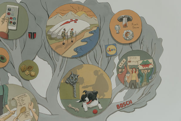 Roxi și Mihai au vrut să își noteze (vizual) câteva dintre lucrurile care îi fac pe ei să fie cine sunt acum. Au vrut să păstreze într-un loc central din casa lor o ilustrare a trecutului lor împreună. Apoi și-au dorit să fie un design care să permită adăugiri, pe măsură ce se adună alte momente importante. Așa am ajuns la copacul cu baloane de săpun pe post de ferestre spre diferite amintiri definitorii pentru ei.